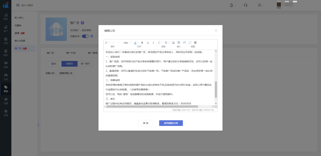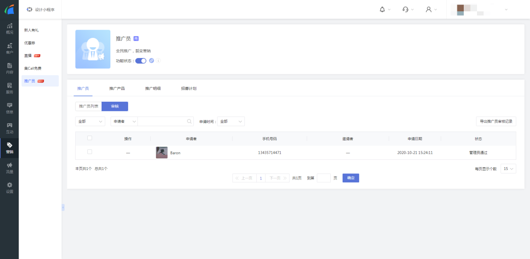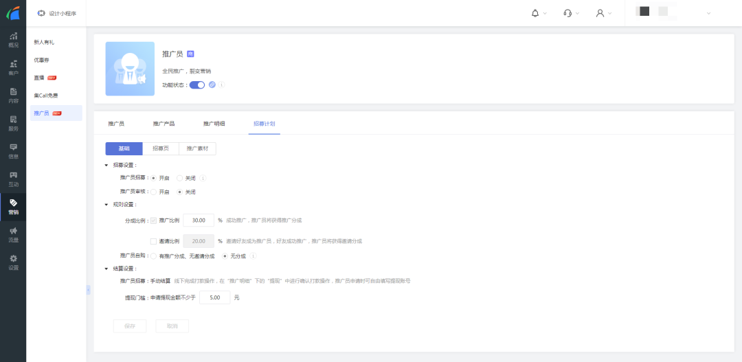 - 招募设置:可管理推广员招募以及推广员审核设置。