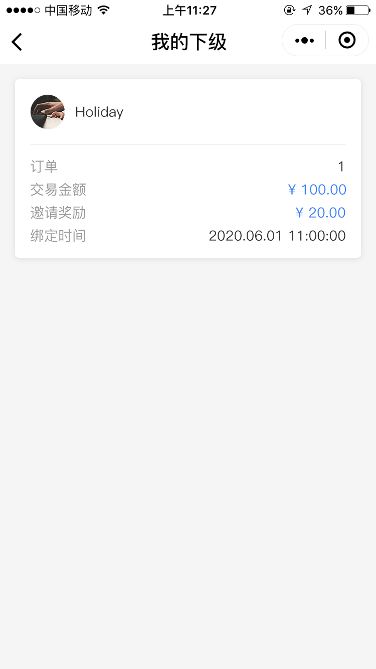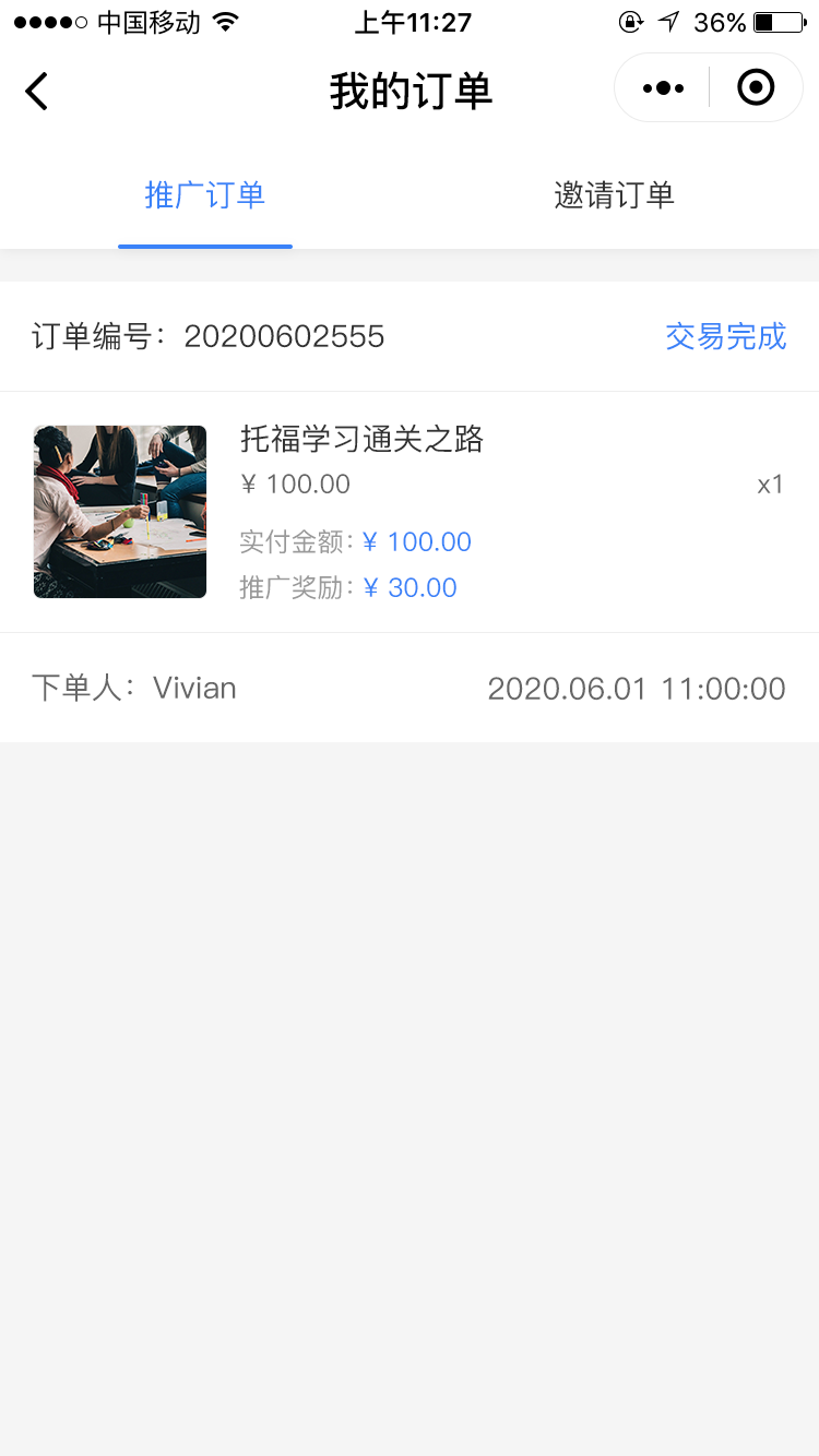 例如:推广员A绑定客户C,邀请A成为推广员的上级推广员是B;当客户C成功购买推广商品后,各角色可分别查看各自收益。
