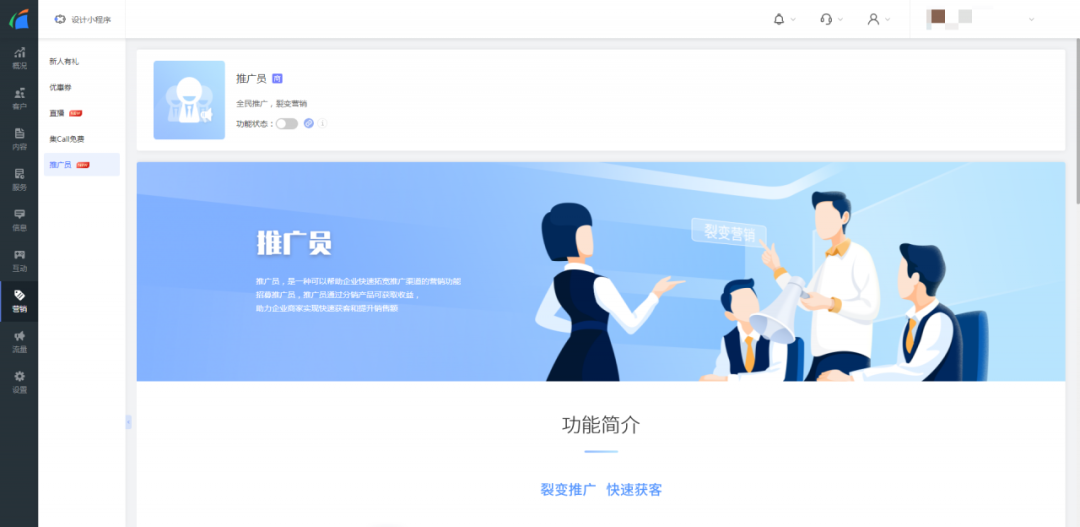 1. 管理员可在「管理后台-营销-推广员」中开启推广员功能。
