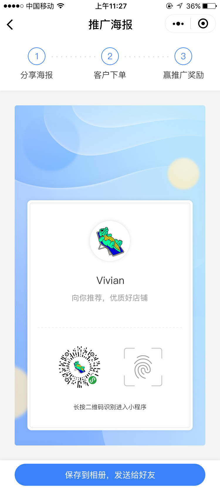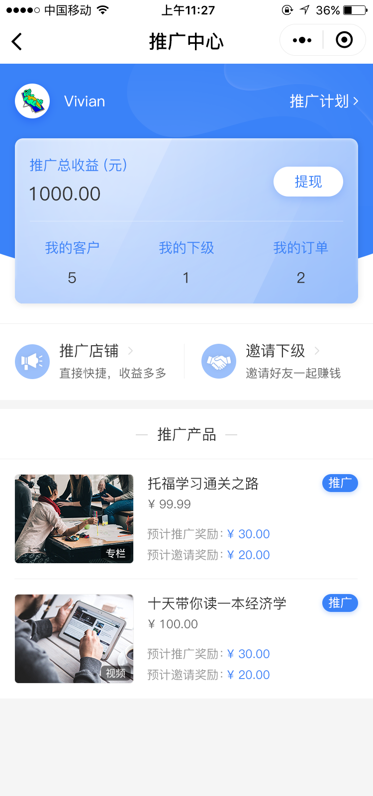 4. 管理员通过访客的推广员申请后,推广员即可开始推广产品、店铺以及邀请下级: