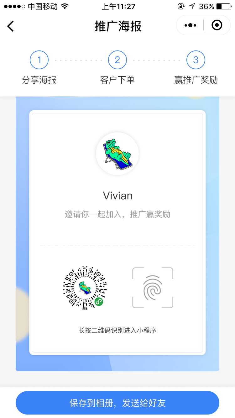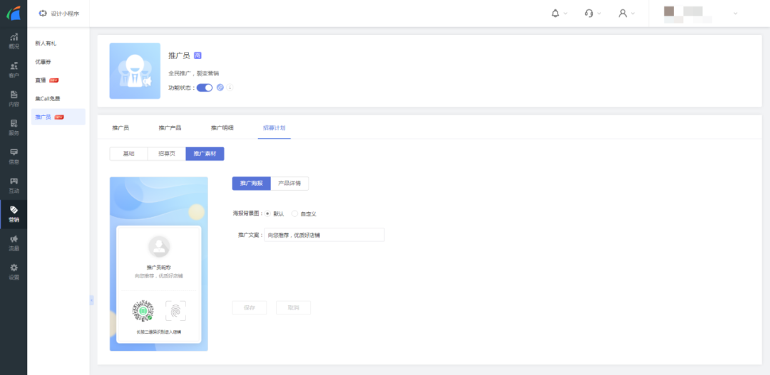 - 推广海报:可支持设置海报背景图以及推广文案。