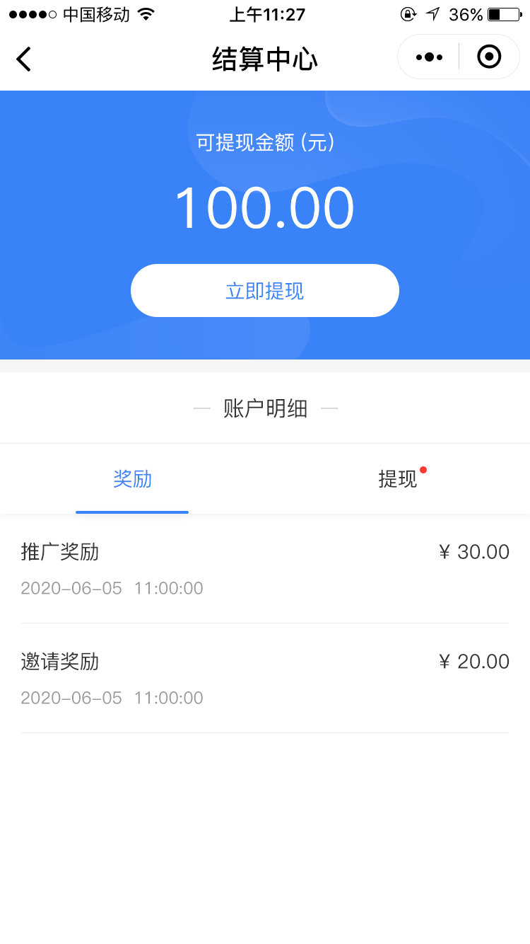 6. 推广员推广累计达到提现金额要求后,可在推广中心申请提现。