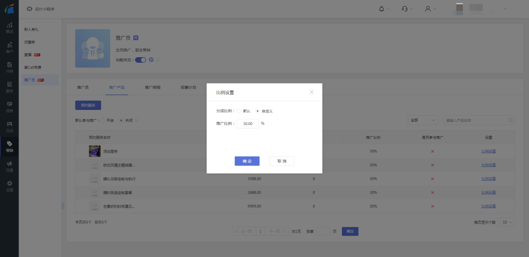 - 规则设置:可设置推广订单的分成比例,比如,推广商品的价格是100元,推广员成功推广后,可获得100*x%的奖励;